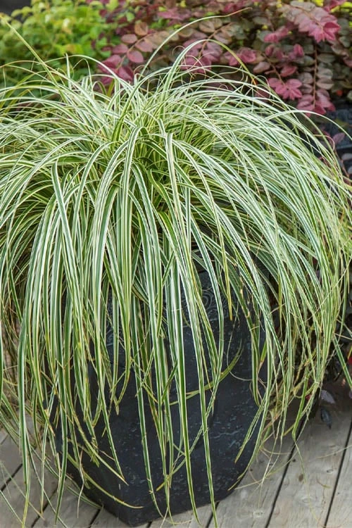 A supersized and super-fast growing Carex that can achieve 2 feet in height with a spread of over 4 feet in just a couple years, ‘Feather Falls’ forms a gracefully cascading mound of striking green and white striped grassy leaves with a lovely waterfall form. Excellent as a specimen, in groupings or as a border in the landscape and truly spectacular in pots, planters and other containers where the foliage will spill over the edges like a waterfall. This one has more sun tolerance than other variegated Carex oshimensis, plus good heat tolerance, but we still say no direct midafternoon sun.